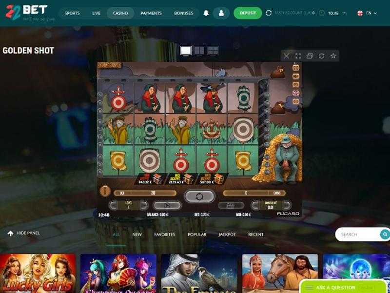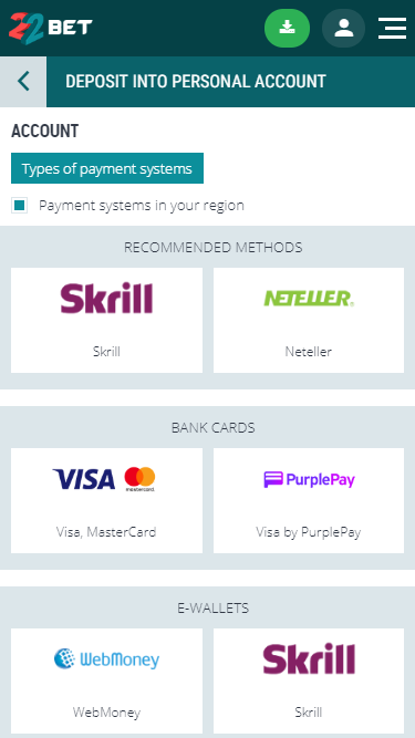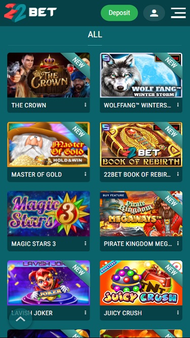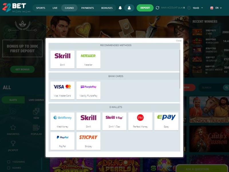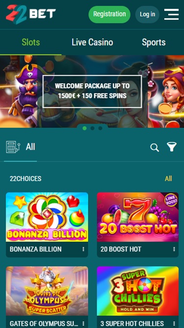 يعمل موقع 22Bet بواسطة Playtech, BetSoft, 1x2gaming, Amatic Industries, Espresso Games, Evolution Gaming, Ezugi, Genesis Gaming, Habanero Systems, HO Gaming, iSoftBet, Novomatic, Oryx, Play'n GO, playson, Quickspin, Rival, Saucify, SOFTSWISS, Thunderkick, Vivo Gaming, WM, Yggdrasil, Endorphina, Wazdan, Realistic Games, Arrows Edge, Booming Games, Gameplay Interactive, PlayPearls, Pragmatic Play, Nolimit City, Red Tiger Gaming, ZEUS Services, Booongo, LuckyStreak, Spinomenal, Felix Gaming, Red Rake Gaming, Inbet Games, Xprogaming, Fugaso, Belatra Games, SYNOT Games, Mobilots, Revolver Gaming, Platipus Gaming, Spinmatic, Spadegaming, BGAMING, Concept Gaming, Fazi, Evoplay, SA Gaming, OneTouch, Pocket Games Soft, Dreamtech Gaming, Triple PG, Gluck Games, Bunfox Games, CQ9 Gaming, Mascot Gaming, TVBet, NetGame Entertainment, Slot Factory, DLV, Radi8 Games, Spearhead Studios, Swintt, ThunderSpin, Super Spade Games, TrueLab Games, Mancala Gaming, 7Mojos, SmartSoft Gaming, KA Gaming, Atmosfera, FilsGame, Lady Luck Games, Holle Games, Caleta Gaming, Eurasian Gaming, Wizard Games, Ash Gaming, CT Interactive, EveryMatrix, Greentube, Igrosoft, omi-gaming, Pariplay, Tom Horn Gaming, Cayetano, Genii, Mr Slotty, Authentic Gaming, Top Trend Gaming, BF Games, betiXon, Capecod Gaming, Iron Dog Studio, Aspect Gaming, Apollo Games, Gamevy, NetGaming, High 5 Games, GMW, Groove Gaming, PlayStar, Rarestone Gaming, Vibra Gaming, Black Pudding Games, Hacksaw Gaming, Max Win Gaming, SimplePlay, Triple Cherry, Absolute Live Gaming, Charismatic, Onlyplay, FastSpin, Armadillo Studios, Gamebeat, FlipLuck, Playgon, Bombay Live, Leap Gaming, Betradar, GoldenRace, n2-LIVE, Winfinity, 3 Oaks Gaming, Spribe, BBIN, 1spin4win, JVL, Live88, Zillion Games, Playzia, Formula Spin, Bigpot Gaming, Pixmove Games, PlayAce, ABXplay, Turbo Games and Blaze Gaming ، ويمكن الوصول إلى منصة الكازينو عبر متصفح الإنترنت، دون الحاجة إلى تنزيل أي برامج على منصتك. يدعم الموقع اللعب عبر الأجهزة المحمولة، ما يتيح لك اختبار حظك باستخدام الهواتف الذكية والأجهزة اللوحية.