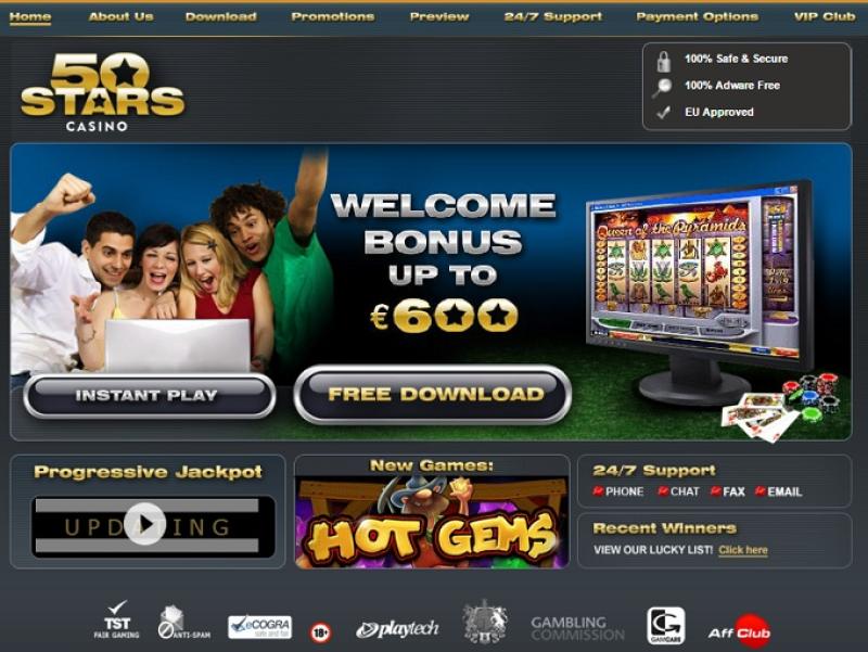 كازينو 50 ستارز هو موقع ألعاب إلكترونية انطلق عام 2005. يفخر الموقع بتوفير أنظمة كازينو متطورة وتجربة لعب شيقة للاعبيه، كل ذلك بفضل برنامج بلايتك. يمكن للاعبين اللعب فورًا من خلال ميزة اللعب الفوري أو تنزيل البرنامج المجاني في ثوانٍ. يضم الموقع مجموعة متنوعة من الألعاب، وعروضًا ترويجية متنوعة، ودعمًا فنيًا على مدار الساعة طوال أيام الأسبوع عبر الهاتف والدردشة والفاكس والبريد الإلكتروني.