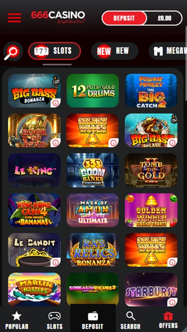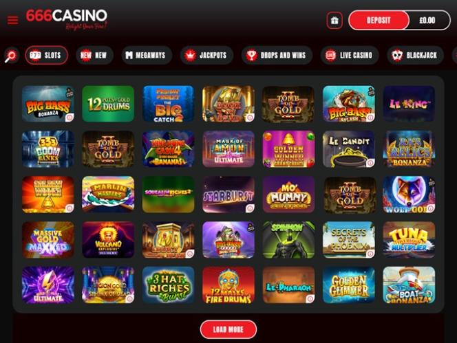 يقدم كازينو 666 أكثر من 1400 ماكينة قمار، مع ألعاب من مطورين رائدين مثل Microgaming وNetEnt وNYX وRabcat وغيرها. تتنوع الألعاب في جودتها، ولكنك ستجد بالتأكيد ما يعجبك. كما يقدم جوائز كبرى متزايدة، بالإضافة إلى ألعاب قمار للهواتف المحمولة تتيح لك اللعب على هاتفك الذكي أو جهازك اللوحي.