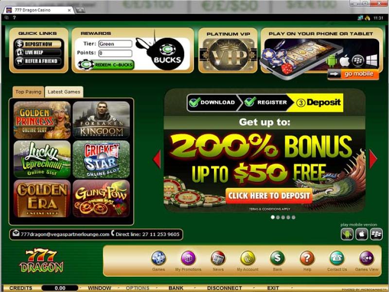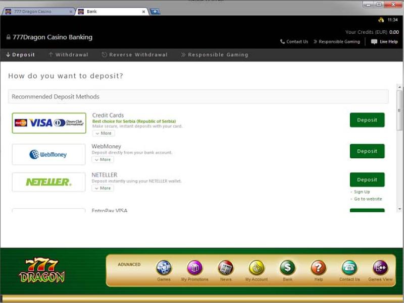 كازينو 777 دراغون يعمل بنظام Microgaming and Games Global ، الذي يوفر مئات الألعاب عبر منصة الكازينو الإلكترونية. لا يتطلب اللعب في كازينو 777 دراغون تنزيل أي برنامج، ويمكن للاعبين أيضًا الوصول إلى الكازينو عبر أجهزتهم المحمولة.خيارات الخدمات المصرفية في 777 Dragon Casino