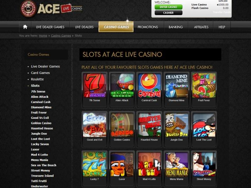 يُقدّم كازينو Ace Live مجموعة مختارة من 21 لعبة فيديو سلوتس، وتبدو الألعاب المعروضة قديمة وتفتقر إلى الميزات المتوفرة في العديد من مواقع المراهنات الإلكترونية الأخرى. كما لا تُقدّم جوائز كبرى تصاعدية حاليًا.برنامج نقاط المنافسة