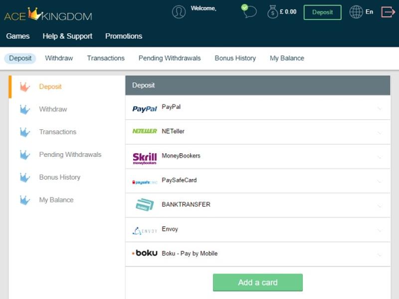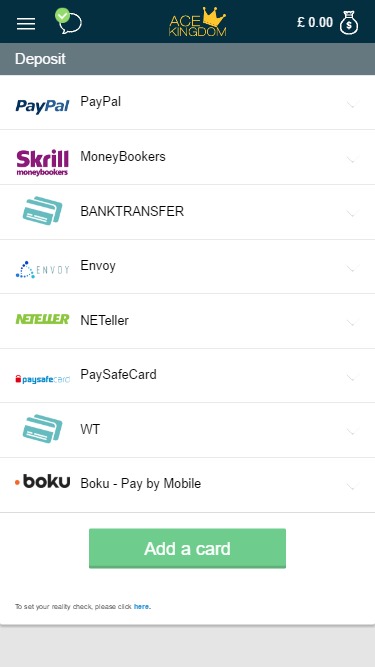 يتم تشغيل كازينو AceKingdom بواسطة Playtech ، ويتم توفير ألعابه من خلال منصة تعتمد على الويب بالإضافة إلى موقع محمول يسمح باللعب على الهواتف الذكية والأجهزة اللوحية.