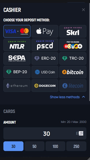 💰 الحد الأدنى للإيداع€3 (Crypto)/€20 (Other methods)