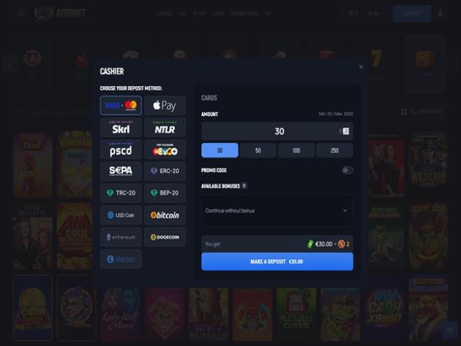 فيما يتعلق بطرق الدفع، يمكنك استخدام العديد من الخيارات المصرفية لإدارة أموالك في Aerobet، بما في ذلك Visa وMastercard و Skrill وMiFinity و Apple Pay وPaysafecard وMB Way. كما تقبل العلامة التجارية العديد من العملات الرقمية مثل Bitcoin و Dogecoin و Ethereum و Litecoin وUSD Coin و Tether .