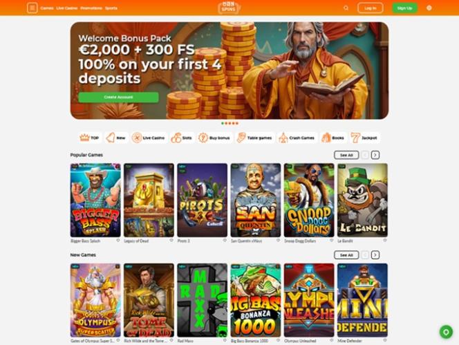 عند فتح الموقع، ظهرت لنا صفحة رئيسية أتاحت لنا فورًا الإيداع وبدء اللعب، مع إمكانية اختيار باقة الترحيب التي نرغب بها. كما تتيح لنا الصفحة الرئيسية تصفح فئات الألعاب والاطلاع على أشهرها.