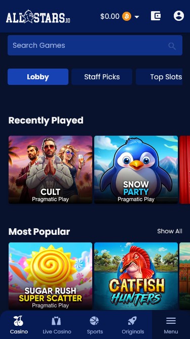 يُقدّم كازينو AllStars انطباعًا أوليًا قويًا بفضل تصميمه الجريء والحيوي الذي يُناسب اللاعبين الذين يُفضّلون التنوّع. تزخر الصفحة الرئيسية بألعاب السلوتس، وألعاب الكراش، وطاولات الكازينو المباشر، وأسواق المراهنات الرياضية، والعروض الترويجية المُستمرة، ما يضمن وجود شيء مُثير دائمًا. يُضفي الكازينو طابعًا عصريًا مُستوحى من عالم الكازينوهات الرقمية، مع سهولة تصفّحه دون الشعور بالضياع.