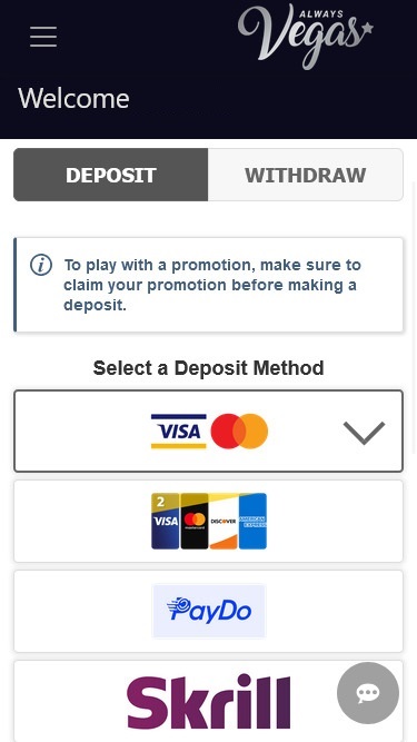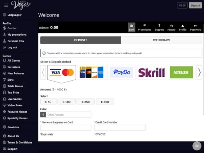 يتم تشغيل كازينو Always Vegas بواسطة BetSoft, Rival and Fresh Deck Studios ، ويمكن الوصول إلى مكتبة الكازينو الخاصة به من خلال برنامج قابل للتنزيل بالإضافة إلى منصة تعتمد على الويب.خيارات الخدمات المصرفية في Always Vegas