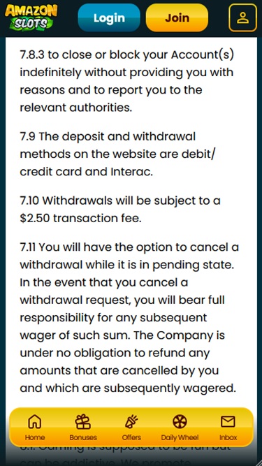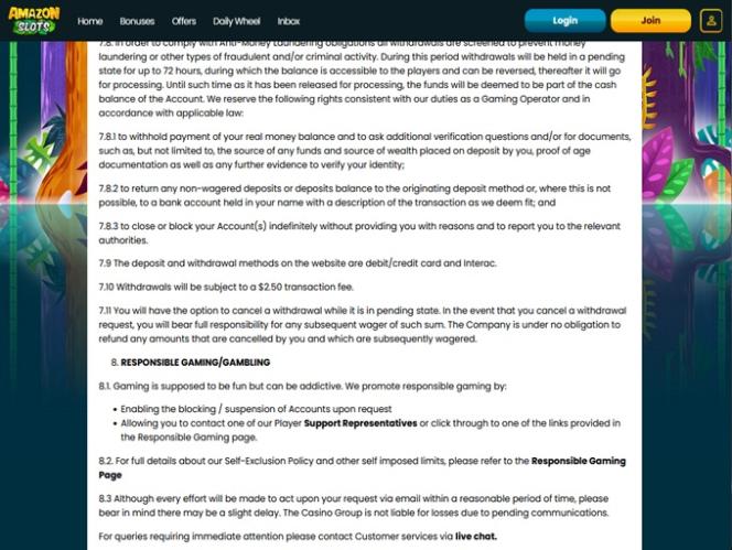 قد يبدو هذا مملاً ومُرهقاً، لكننا ننصح بقراءته، إذ قد يؤثر ذلك بشكل كبير على مستوى ترفيهك في نهاية اليوم. بالنسبة لـ Amazon Slots Ontario، أعددنا قائمة قصيرة بالشروط المهمة التي نعتقد أنه يجب عليك مراعاتها: