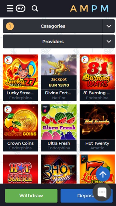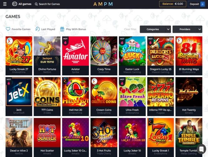 يضم موقع AMPM مجموعة رائعة من ألعاب الفيديو سلوتس، تضم أكثر من 5000 عنوان متاح. سيتمكن اللاعبون من جميع مستويات الخبرة والأذواق من العثور على ألعابهم المفضلة على هذا الموقع.
