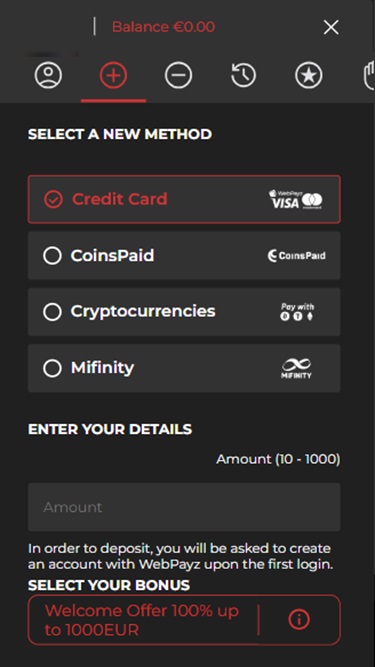 فيما يتعلق بخيارات الدفع المتاحة على الموقع، يمكن للاعبين اختيار استخدام طرق الدفع التقليدية والحديثة للسحب والإيداع. أما من يفضلون الطرق التقليدية، فيمكنهم استخدام Visa و Mastercard و Neteller و Skrill و Payz وغيرها.