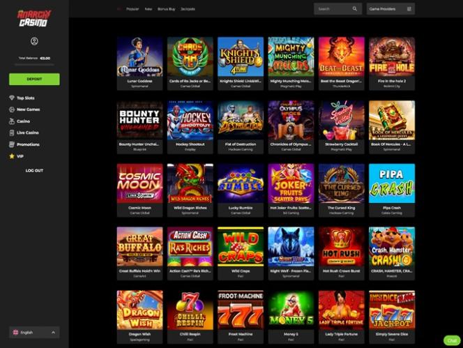 في كازينو Anarchy، يمكنك الوصول إلى ألعاب من أكثر من 95 استوديوًا لتطوير البرمجيات، وهو عدد كبير جدًا. توفر لك هذه العلامة التجارية ساعات لا تُحصى من الترفيه من خلال استكشاف تجارب ألعاب فريدة وتصفحها.