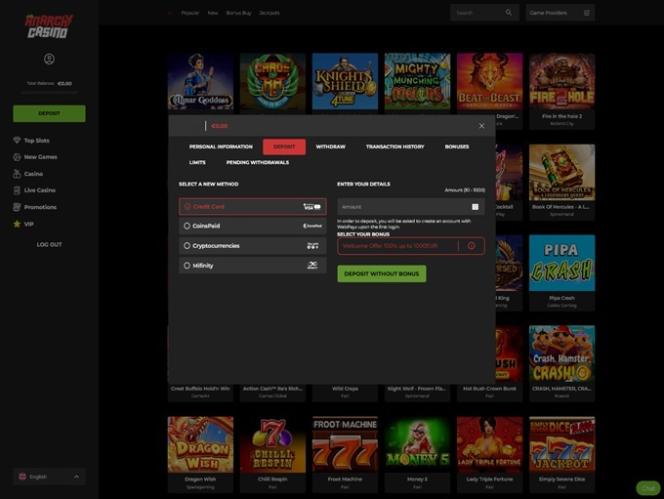 إلى جانب برنامج الولاء المتميز، يمكن للاعبي كازينو Anarchy أيضًا الاستفادة من عروض ترويجية ومكافآت متنوعة. وقد أعدّت الشركة المشغلة باقات ترحيبية مميزة للاعبين الجدد. كما تقدم مكافآت قيّمة للاعبين الحاليين ، فلا يشعر أي منهم بالاستبعاد.