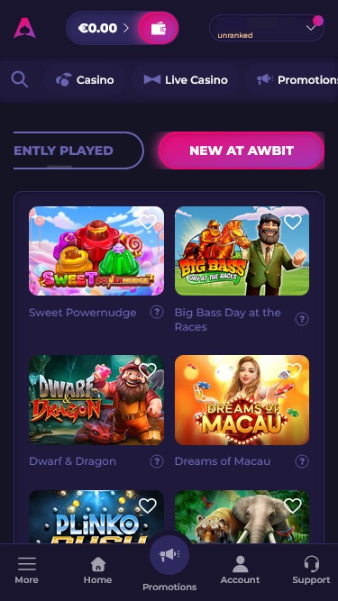 يُقدّم الكازينو أيضًا عروضه الترويجية الجذابة ومجموعة Awbit، وهي ميزة مبتكرة تُتيح للاعبين ربح نسبة استرداد نقدي جماعية ومكافآت حصرية. من خلال الإيداع ولعب الألعاب، يُمكنك ربح تذاكر، والتي يُمكنك إضافتها لاحقًا إلى مجموعة Awbit. هذا يُؤهلك للاستفادة من جميع المزايا.