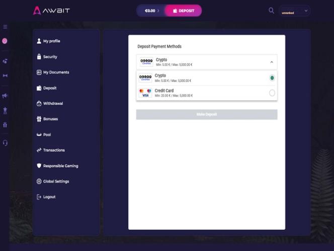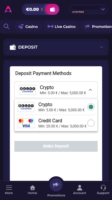 تتيح هذه العلامة التجارية للاعبين الإيداع والسحب باستخدام طرق دفع متعددة، بما في ذلك العملات المشفرة الحديثة. الخيارات المتاحة هي بيتكوين ، وبيتكوين كاش ، ودوجكوين ، ولايتكوين ، وإيثريوم ، و USD Coin ، وترون ، وريبل . بالإضافة إلى ذلك، يمكن للاعبين استخدام الطرق التقليدية مثل فيزا ، وماستركارد ، والتحويل البنكي ، ونيتيلر ، وسكريل .