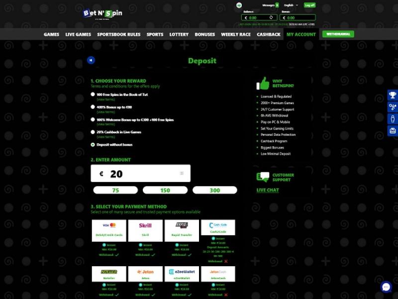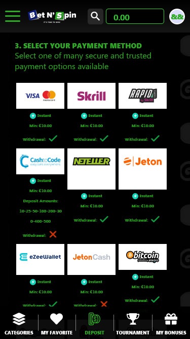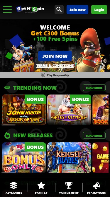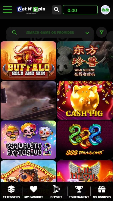 يعمل كازينو Bet N Spin بنظام Microgaming, Net Entertainment, BetSoft, 1x2gaming, Big Time Gaming, ELK Studios, Evolution Gaming, Ezugi, Habanero Systems, iSoftBet, Oryx, Play'n GO, playson, Quickspin, Relax Gaming, Thunderkick, Endorphina, Wazdan, Betgames, Booming Games, BetConstruct, Pragmatic Play, Red Tiger Gaming, Booongo, Red Rake Gaming, Inbet Games, Xprogaming, Fugaso, Kalamba, Revolver Gaming, Spinmatic, Spadegaming, Triple Edge Studios, BGAMING, Fazi, Evoplay, Pocket Games Soft, Mascot Gaming, Slot Factory, Spearhead Studios, Swintt, SmartSoft Gaming, KA Gaming, Lady Luck Games, Caleta Gaming, Games Global, Amusnet Interactive, Wizard Games, CT Interactive, NextGen, Pariplay, Push Gaming, Tom Horn Gaming, Genii, Gamomat, Mr Slotty, Apollo Games, Golden Hero, NetGaming, High 5 Games, Hacksaw Gaming, Gamzix, Arcadem, Peter And Sons, Onlyplay and Armadillo Studios ، وتُقدم ألعاب الكازينو عبر منصة ويب تُحمّل مباشرةً من خلال متصفح الإنترنت. كما يدعم الكازينو اللعب عبر الهاتف المحمول بالكامل، ما يتيح لك المراهنة على هاتفك الذكي أو جهازك اللوحي.