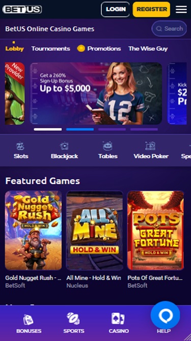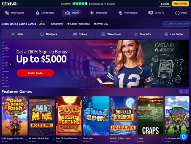 يتم تشغيل كازينو Bet US بواسطة BetSoft, Visionary iGaming, Nucleus Gaming, Fresh Deck Studios, Digital Gaming Solutions, Wager Gaming, Dragon Gaming and Dragoon Soft ، والذي يمنح اللاعبين فرصة الوصول إلى ألعاب الكازينو من خلال موقع الكازينو على الويب.المقامرة المسؤولة ودعم العملاء والأمان