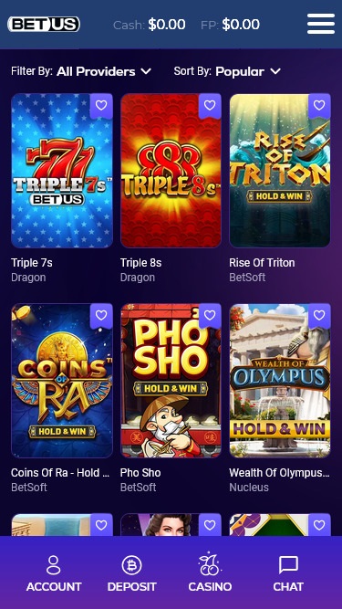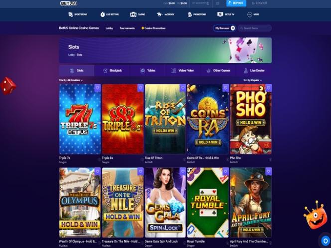 لا يوجد سوى ١٠ ماكينات قمار متاحة للعب في كازينو Bet US، وهي عادية جدًا من حيث العرض والميزات. هناك العديد من الكازينوهات الأخرى التي تقدم خيارات ماكينات قمار أكثر بكثير.برنامج نقاط المنافسة