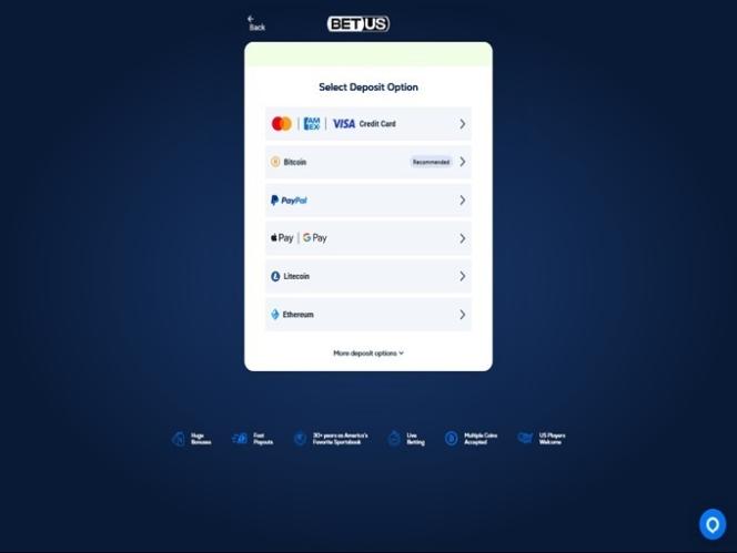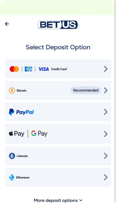 ستجد أدناه خيارات الخدمات المصرفية المختلفة في Bet US، بما في ذلك خيارات الإيداع والسحب في الموقع.