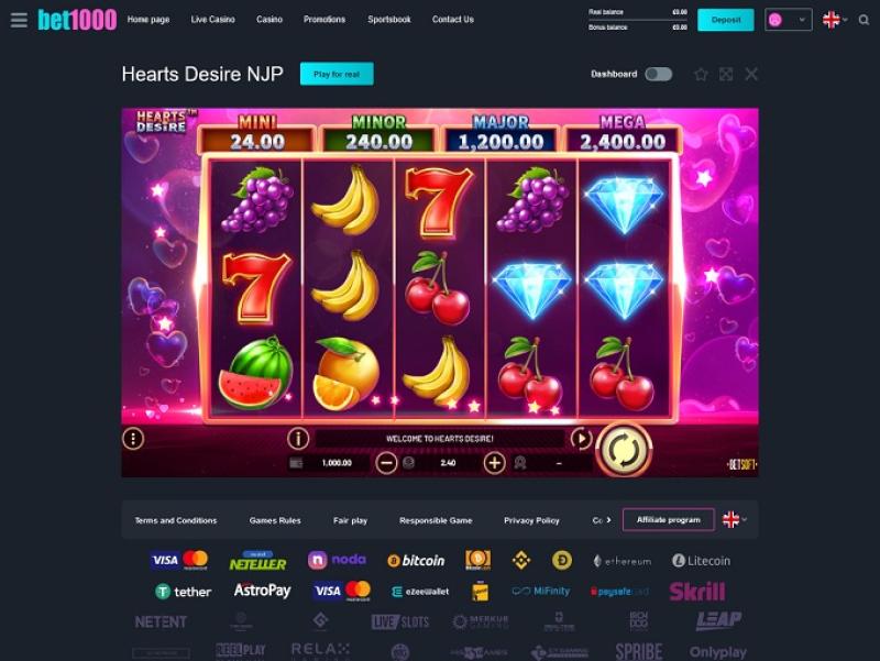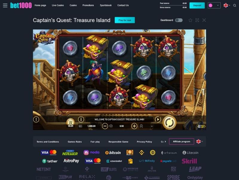 كازينو Bet1000 مُدار ومملوك لشركة ألعاب إلكترونية ذات خبرة، مُسجلة بموجب قوانين كوراساو، ومرخصة ومنظمة من قِبل Antillephone NV. يستهدف هذا الكازينو اللاعبين من النرويج وفنلندا وأيرلندا.