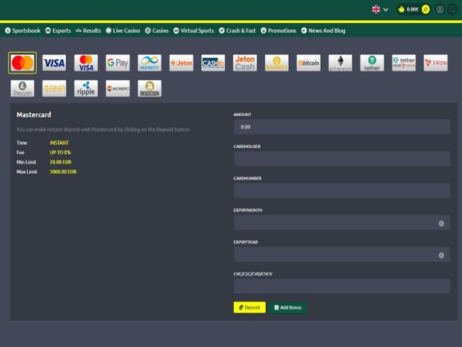 يدعم أمين الصندوق في الكازينو عددًا جيدًا من خيارات الدفع مثل التحويل المصرفي المباشر، وبطاقات الإيداع والدفع الائتمانية المعروفة، والمحافظ الإلكترونية المستخدمة على نطاق واسع مثل Skrill وNeteller، وأنظمة الدفع عبر الإنترنت الأخرى.