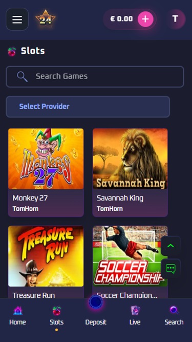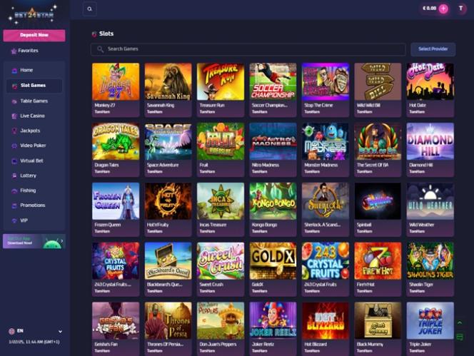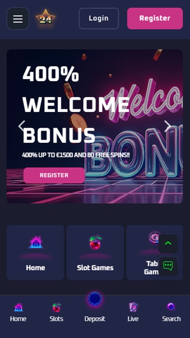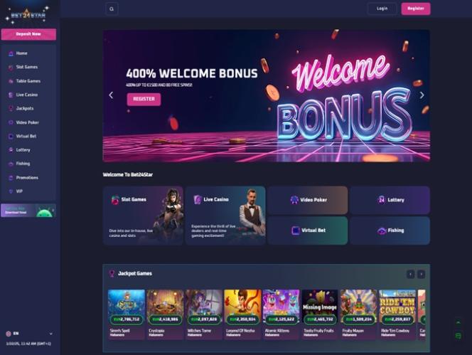 منصة الكازينو تستخدم خلفية داكنة، وهي متجاوبة ومُحسّنة لجميع الأجهزة، سواءً كانت سطح مكتب أو جوال. Bet24Star منظم بشكل جيد، ويبدو مُدمجًا وسهل الاستخدام.