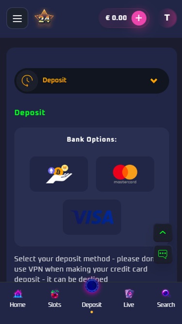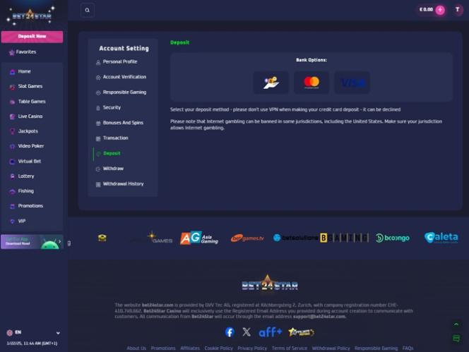 - تحتفظ Bet24Star بالحق في تحديد الحد الأدنى و/أو الحد الأقصى لمبلغ الإيداع المسموح به.