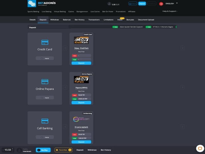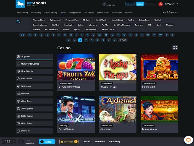 يعمل كازينو بيتادونيس بنظام Microgaming, Net Entertainment, BetSoft, 1x2gaming, Amatic Industries, Big Time Gaming, Evolution Gaming, EYECON, Ezugi, Genesis Gaming, Habanero Systems, iSoftBet, lightningboxgames, playson, Quickspin, Rabcat, WM, Wazdan, Realistic Games, Booming Games, Pragmatic Play, LuckyStreak, Spinomenal, Red Rake Gaming, Skillzzgaming, Xprogaming, Platipus Gaming, Triple Edge Studios, Northern Lights Gaming, Evoplay, Stormcraft Studios, Switch Studios, SA Gaming, Electric Elephant Games, All41 Studios, Gluck Games, Gameburger Studios, Pulse 8 Studios, Neon Valley Studios, Golden Rock Studios, Spearhead Studios, SpinPlay Games, GONG Gaming, Lady Luck Games, Buck Stakes Entertainment, Games Global, Amusnet Interactive, Wizard Games, 2by2 Gaming, Ainsworth, Pariplay, Tom Horn Gaming, Genii, Spigo, Mr Slotty, MGA, Authentic Gaming, Old Skool Studios, Foxium, Just For The Win, Storm Gaming Technology, PearFiction Studios, Apollo Games, Wild Streak Gaming, Slingshot Studios, Fortune Factory Studios, Gamevy, Crazy Tooth Studio, Alchemy Gaming, Plank Gaming, Black Pudding Games, Snowborn Games, Hacksaw Gaming, Gold Coin Studios, Half Pixel Studios, Aurum Signature Studios and Charismatic ، الذي يوفر مجموعة واسعة من الألعاب المتاحة للعب عبر منصة الكازينو الإلكترونية. كما يوفر بيتادونيس موقعًا للهواتف المحمولة، يتيح للاعبين الوصول إلى قسم المراهنات الرياضية والكازينو عبر الهواتف الذكية والأجهزة اللوحية.خيارات الخدمات المصرفية في BetAdonis