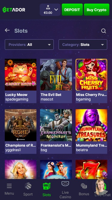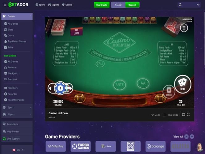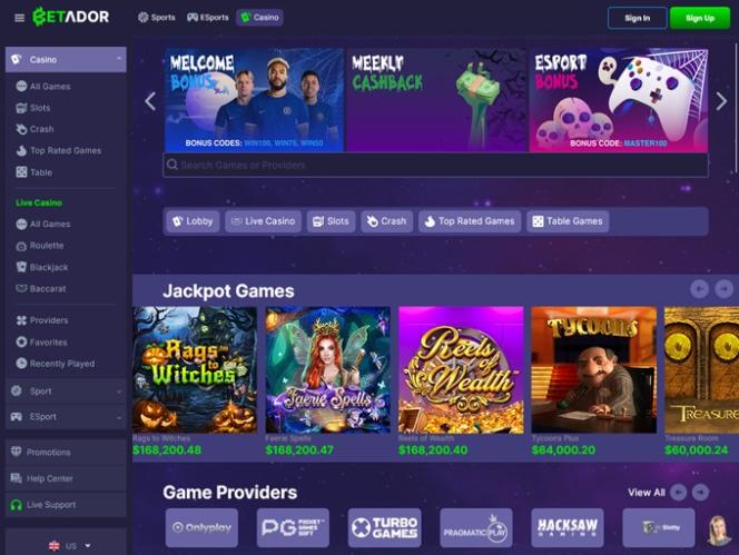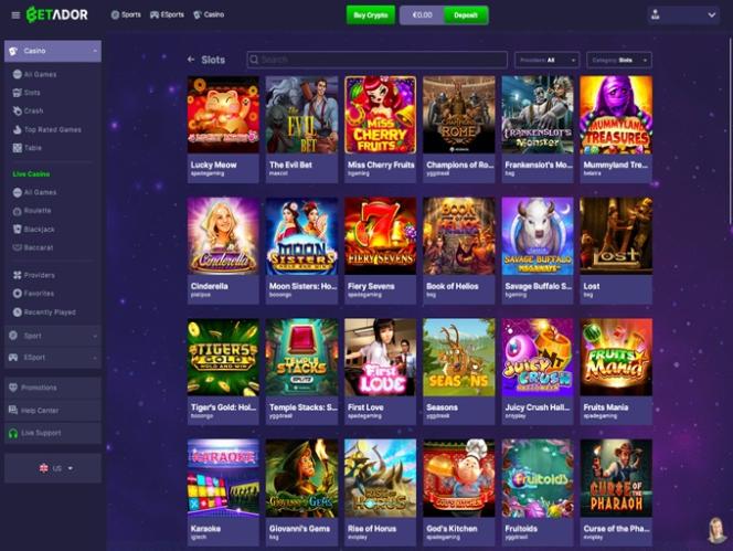 تشمل فئات الكازينو الرئيسية: اللوبي، والكازينو المباشر، وماكينات القمار، والكراش، والألعاب الأعلى تقييمًا، وألعاب الطاولة. على الرغم من أننا شهدنا مكتبات ألعاب أكبر بكثير، سيتمكن اللاعبون من تجربة مجموعة واسعة من الأنواع في بيتادور، بما في ذلك ألعاب العملات المشفرة الشهيرة التي تهم أعضاء الكازينوهات الحديثة بشكل خاص.