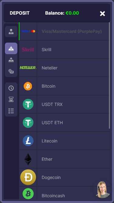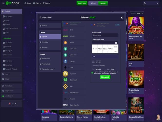 يدعم كازينو Betador العديد من العملات المشفرة الشهيرة وخيارات الدفع بالعملات المشفرة ، ولكنه يشمل أيضًا طرق الدفع التقليدية مثل بطاقات الخصم والائتمان والمحافظ الإلكترونية المعروفة وأنظمة الدفع عبر الإنترنت الأخرى.