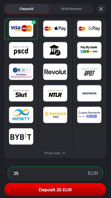 وأخيرًا وليس آخرًا، تتضمن قائمة الألعاب تشكيلة واسعة من ألعاب التصادم الفوري، وهي خيار مثالي للاعبين الذين يبحثون عن لعبة سريعة وبسيطة. من أشهر ألعاب التصادم الفوري المتوفرة: Chicken Run، وPiggy Tap، وAviator، وPilot، وPlinko، وDragon's Crash، وChristmas Crash، وMighty Crash، وTriple Cash or Crash.