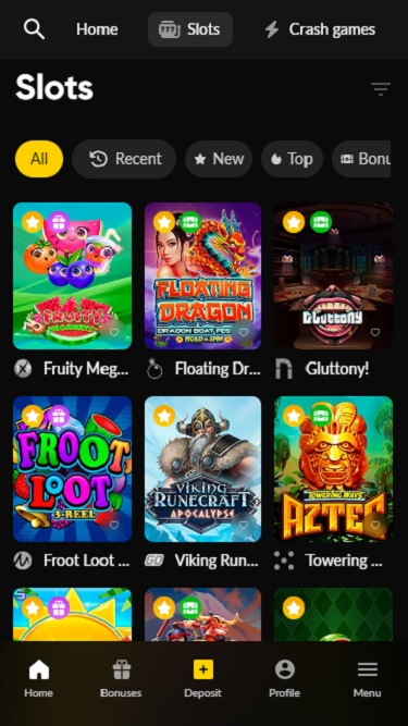 يتم تنظيم الألعاب المتاحة في أقسام مثيرة للاهتمام: ألعاب السلوتس، وألعاب كراش، والألعاب السريعة، والرياضات الإلكترونية، والكازينو المباشر، والبينغو، وألعاب التلفزيون... الأقسام مليئة بعناوين الكازينو الشهيرة ونحن متحمسون للتحقق منها: