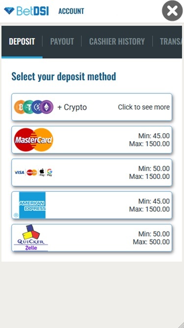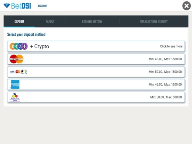كما ذكرنا سابقًا، يقبل BetDSI العملات المشفرة كطريقة دفع معتمدة. بيتكوين، إيثريوم، لايتكوين ، وريبل هي بعض العملات المتاحة. مع ذلك، تجدر الإشارة إلى أن معظم العملات المشفرة تُقبل فقط كطريقة إيداع ، بينما خيارات السحب أقل تنوعًا.