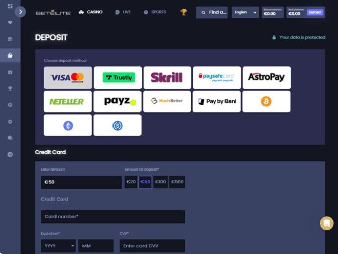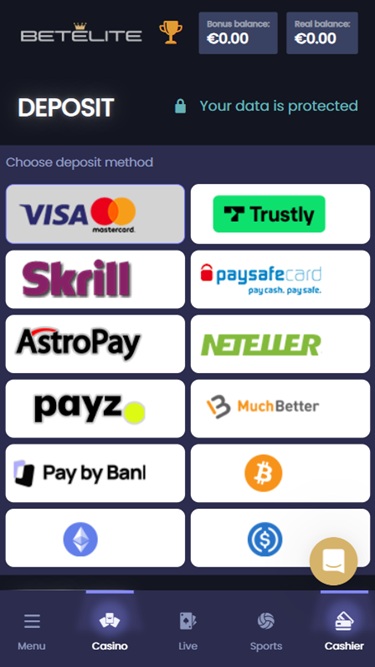 يوفر BetElite للاعبيه خيارات دفع متعددة للإيداع والسحب. تشمل الطرق التقليدية Visa و Mastercard و Apple Pay وPayPal و Paysafecard و MuchBetter وSkrill و Neteller والتحويل البنكي و Payz و Trustly . أما الطرق الحديثة، فتشمل العملات المشفرة مثل Bitcoin و Ethereum و USD Coin .