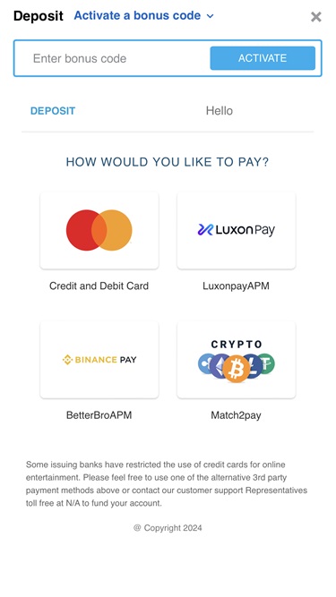 يسعدنا أن نرى أن العلامة التجارية توفر للاعبين خيارات دفع واسعة للغاية. بدايةً، تتوفر طرق دفع تقليدية مثل فيزا ، وماستركارد ، وأستروباي ، وجيتون ، وإنتراك . كما تُقبل عمليات الإيداع والسحب بالعملات المشفرة، والعملات المتاحة هي بيتكوين ، وإيثريوم ، ولايتكوين ، وتيثر ، وترون ، وريبل .
