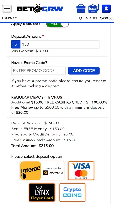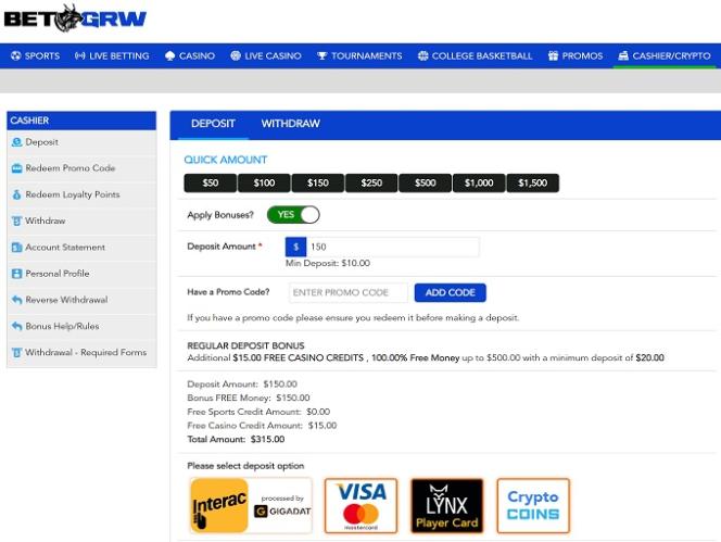 يقدم كازينو BetGRW لمستخدميه طرق دفع حديثة وتقليدية للإيداع والسحب. تشمل الخيارات القياسية فيزا ، وماستركارد ، وإنتراك ، بينما تشمل الخيارات الحديثة العملات المشفرة داش ، وبيتكوين ، وبيتكوين كاش ، وإيثريوم ، ولايتكوين ، ودوجكوين .