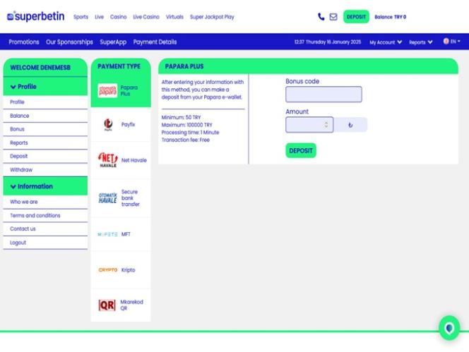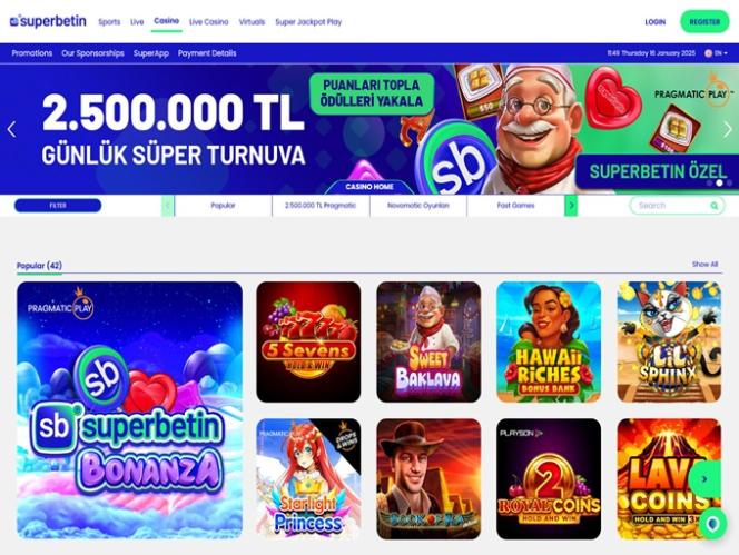 كازينو بيتين مدعوم من Net Entertainment, Playtech, BetSoft, 1x2gaming, Amatic Industries, Big Time Gaming, Evolution Gaming, Ezugi, Habanero Systems, Oryx, Play'n GO, playson, Quickspin, Relax Gaming, Thunderkick, Vivo Gaming, WM, Yggdrasil, Wazdan, GameArt, Betgames, Booming Games, Stakelogic, Pragmatic Play, Nolimit City, Felt Gaming, Red Tiger Gaming, LuckyStreak, Spinomenal, Red Rake Gaming, Xprogaming, Fugaso, Fantasma Games, Kalamba, Revolver Gaming, BGAMING, Concept Gaming, Northern Lights Gaming, Evoplay, Electric Elephant Games, Pocket Games Soft, Bulletproof Games, Gluck Games, Mascot Gaming, TVBet, 7Mojos, SmartSoft Gaming, KA Gaming, Blue Guru Games, Amusnet Interactive, CT Interactive, Leander Games, Push Gaming, Tom Horn Gaming, Genii, BF Games, Iron Dog Studio, We Are Casino, Reflex Gaming, Storm Gaming Technology, STHLM Gaming, 4ThePlayer, AvatarUX, Gamevy, ReelPlay, SlotVision, BB Games, Black Pudding Games, Boomerang Studios, Max Win Gaming, Bang Bang Games, Triple Cherry, SilverBack Gaming, Peter And Sons, Charismatic, Onlyplay, Leap Gaming, Betradar, GoldenRace and 3 Oaks Gaming ، والذي يوفر ألعابه عبر منصة ويب. كما يتوفر موقع جوال لمن يرغبون في اللعب على هواتفهم الذكية وأجهزتهم اللوحية.خيارات الخدمات المصرفية في Superbetin