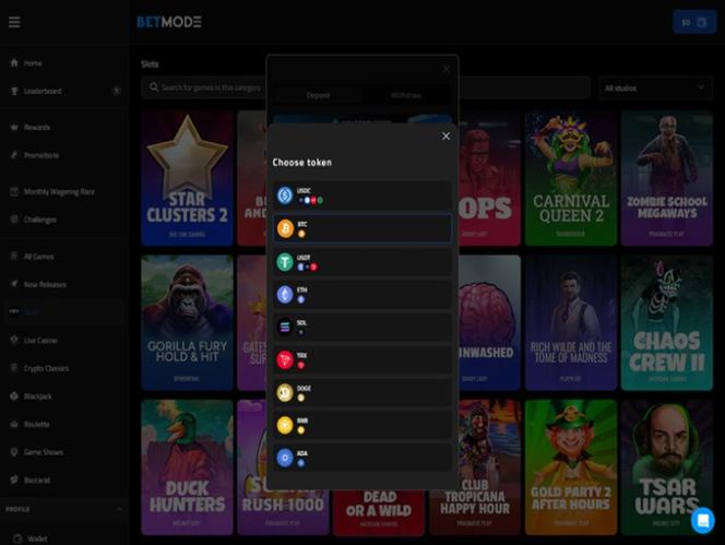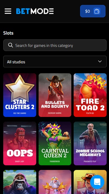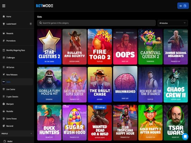 فيما يلي بعض العناوين التي يمكنك تجربتها في كازينو Betmode: Bullets and Bounty، Oops، Carnival Queen 2، Gorilla Fury، Hold & Hit، The Vault Chase، Brainwashed، Chaos Crew 2، Duck Hunters، Wanted Dead or a Wild، Tsar Wars، Le Bandit، Duel at Dawn، Le King، Life and Death، Disturbed، Reel Rush Xxxtreme، Aiko and the Wind Spirit، Outsourced، Brute Force Alien Onslaught، Rip City، Fist of Destruction، Bonanza Billion، Rise of Ymir، Octo Attack، Mental، Donny Dough، Rotten، Aztec Clusters، Le Pharaoh، Blood and Shadow، Slayer INC، Ze Zeus، Chicken Rush، Sun Quentin 2 Death Row، Twisted Lab، Stormforged، Hand of Anubis، DJ Psycho، Joy Exotic، Evil Eyes، Cloud Princess، Rabid Randy، Loner، بيرل هاربور، بيهيد، رود ريج، بانك تواليت، إيفل غوبلنز، إكس بومب، تراكتور بيم، ستارستروك، عملات الحظ، وولف مون، ميكانيكال كلوفر، لاكي داما مويرتا، لاكي كرو، أدفينتشروس، قطار إلى ريو غراندي، إت كيوبس 2، دورك يونيت، سافاج بافالو سبيريت ميجاوايز، والمزيد.