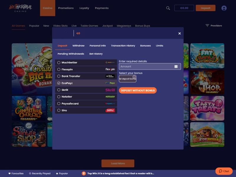 BetOriginal هو كازينو على الإنترنت يُقدم عددًا كبيرًا من الألعاب للاعبين. يُقدم محتوى الكازينو من قِبل بعض عمالقة صناعة برمجيات الكازينو، ولكن نجاح أي مُشغّل لا يُحدد دائمًا بالأرقام. من المهم بنفس القدر، بل أكثر، اختيار اسم اللعبة المناسب. وفي هذا المجال أيضًا، تتفوق BetOriginal.