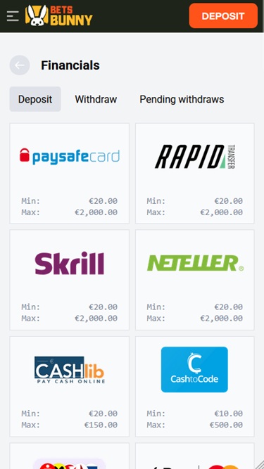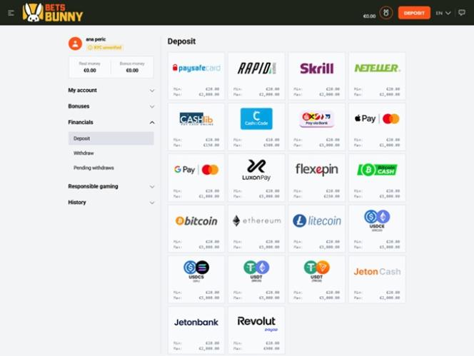 إيداع وسحب الأموال في بيتس باني سهل ومباشر، إذ تقبل الشركة طرق دفع متنوعة، بما في ذلك فيزا ، وماستركارد ، وآبل باي ، وجوجل باي ، والتحويل البنكي ، وسكريل ، ونيتيلر ، وباي سيف كارد ، وفليكسبين . بالإضافة إلى ذلك، يمكن للاعبين استخدام العديد من العملات المشفرة لإدارة أموالهم، مثل بيتكوين ، وبيتكوين كاش ، وإيثريوم ، ولايتكوين ، و USD Coin ، وتيثر .