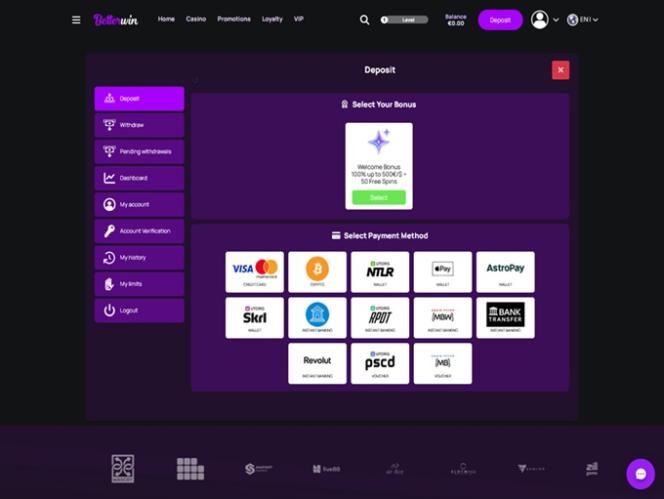من أجل إجراء معاملاتهم المصرفية، يمكن للاعبين اختيار بطاقات الدفع والمحافظ الإلكترونية الشهيرة مثل Neteller وRevolut وSkrill، ولكن يمكنهم أيضًا استخدام العملات المشفرة مثل Bitcoin .