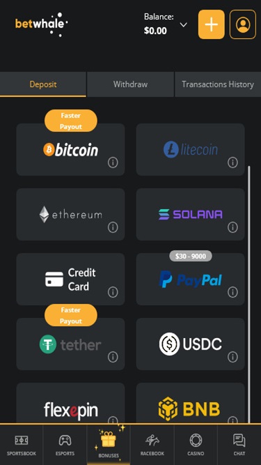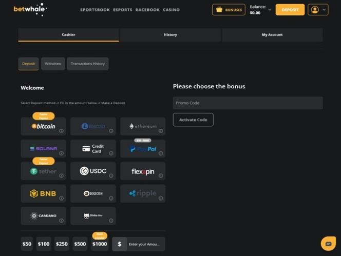 لتسهيل الإيداع والسحب، يُتيح كازينو BetWhale للاعبيه استخدام العديد من طرق الدفع. أما بالنسبة للخيارات التقليدية، فيمكن للاعبين إجراء المعاملات باستخدام فيزا ، وماستركارد ، وأمريكان إكسبريس ، والتحويل البنكي ، وباي بال ، وغيرها. تشمل طرق الدفع الحديثة العديد من العملات المشفرة مثل بيتكوين ، وبيتكوين كاش ، وكاردانو ، ودوجكوين ، وإيثريوم ، وسولانا ، ولايتكوين ، و USD Coin ، وتيثر ، وريبل .