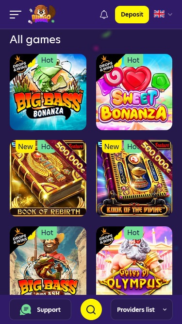 كما هو متوقع من علامة تجارية تحمل اسم "بينغو"، ستُبهر مجموعة البنغو المتوفرة عشاق هذه اللعبة. يُمكنهم تجربة: ميجا بول 100، بينغو الفوري، بينغو الإضافي، كاش أو كراش لايف، جوغو دو بيشو...