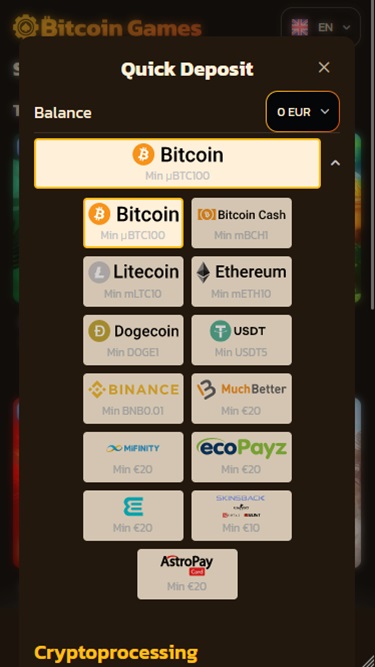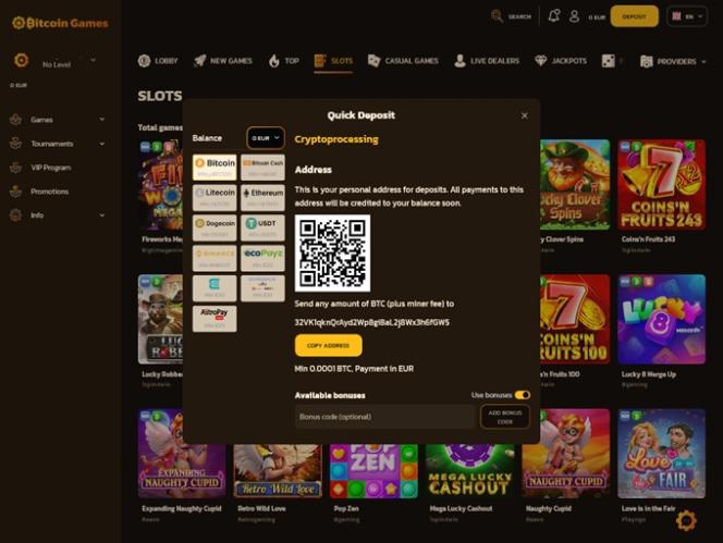 كما يوحي الاسم، كازينو ألعاب بيتكوين هو منصة تركز بشكل أساسي على العملات المشفرة. يمكنك الإيداع والسحب باستخدام بيتكوين ، وبيتكوين كاش ، ودوجكوين ، وإيثريوم ، ولايتكوين ، وتيثر . كما يوفر المشغل العديد من الطرق التقليدية، مثل فيزا ، وماستركارد ، ومايسترو ، وسكريل ، ونتلر ، ونيوسورف ، وميفينيتي ، وماتش بيتر ، وباي سيف كارد .