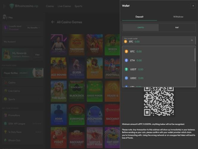 كما يوحي الاسم، فإن كازينو BitcoinVIP هو في المقام الأول كازينو عبر الإنترنت موجه نحو العملات المشفرة، ويمكن للاعبين إدارة الأموال باستخدام العديد من العملات المشفرة، مثل Bitcoin و Bitcoin Cash و Cardano و Ethereum و Litecoin و Solana و Tron و USD Coin و Tether و Ripple .