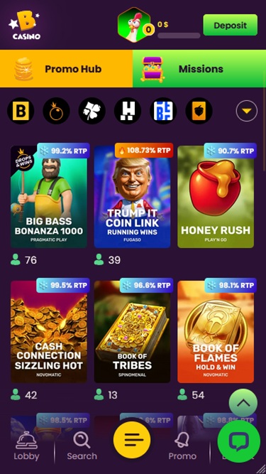القائمة الرئيسية هي جزء من الشريط الجانبي الأيسر وتحتوي على خيارات الألعاب ولوحة المتصدرين، في حين يحتل لوبي الكازينو الموقع المركزي للصفحة، ويتم تقديم جميع الألعاب مع صور مصغرة جميلة.