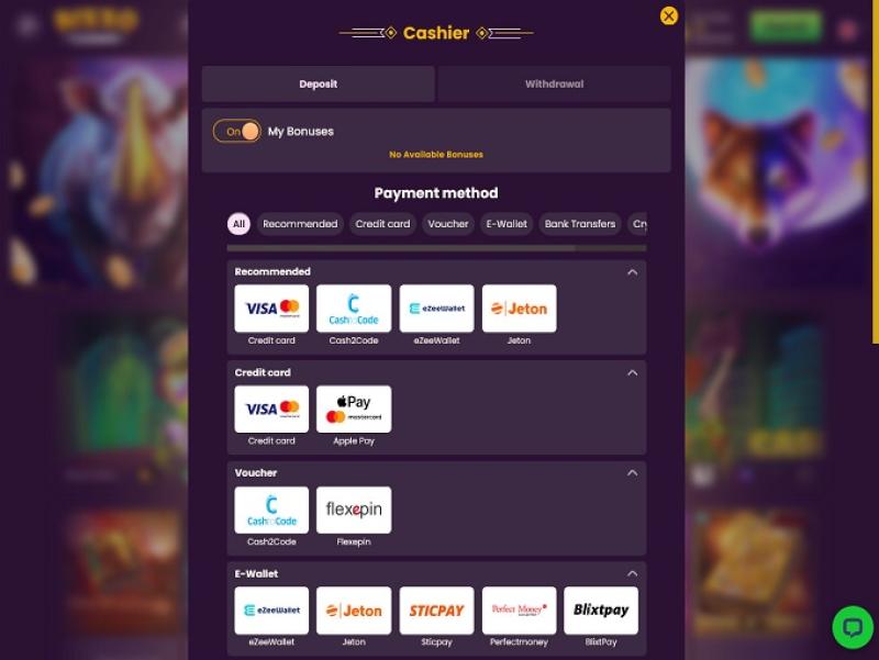 خيارات الخدمات المصرفية في Bizzo Casino