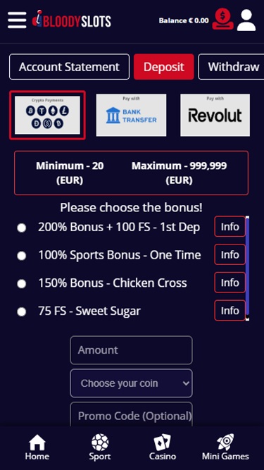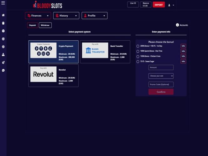 في Bloody Slots، سيكون لدى اللاعبين خيار استخدام طرق دفع متعددة لإيداع وسحب الأموال من حساباتهم في الكازينو، مع كون بعض الخيارات الشائعة هي Visa و Mastercard وApple Pay و Google Pay وMonzo و Bank Wire Transfer وRevolut. كما تقبل العلامة التجارية أيضًا العديد من العملات المشفرة، بما في ذلك Bitcoin و Bitcoin Cash وEthereum و Litecoin و USD Coin و Tether .