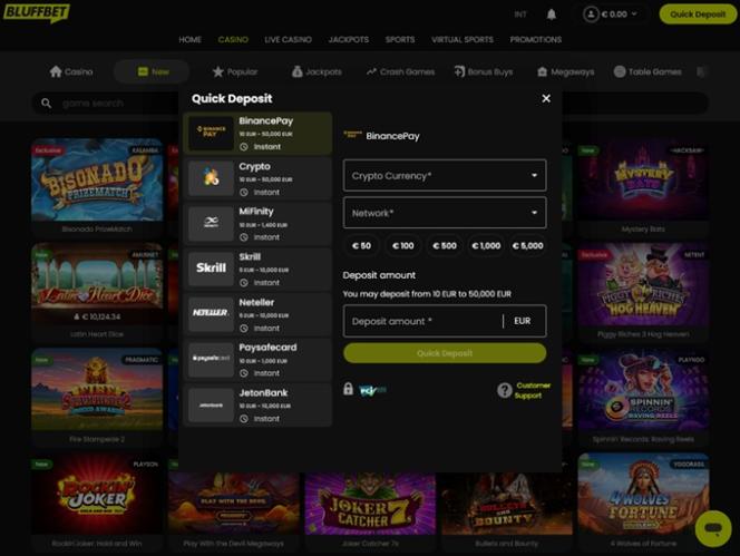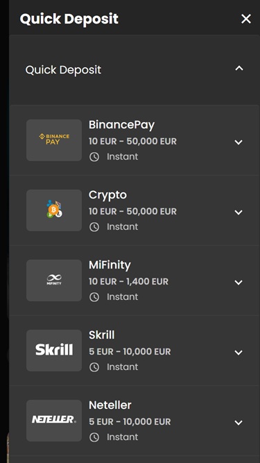 لإيداع وسحب الأموال من حسابك في الكازينو، يمكنك استخدام عدة طرق دفع، بما في ذلك فيزا ، وماستركارد ، وإنتراك ، والتحويل البنكي ، وجيتون ، ومي فينيتي ، وباي سيف كارد ، وموتش بيتر ، وغيرها. كما تقبل العلامة التجارية العديد من العملات المشفرة، بما في ذلك بيتكوين ، وبيتكوين كاش ، وكاردانو ، ودوجكوين ، وإيثريوم ، ولايتكوين ، وسولانا ، وترون ، و USD Coin ، وتيثر ، وريبل .