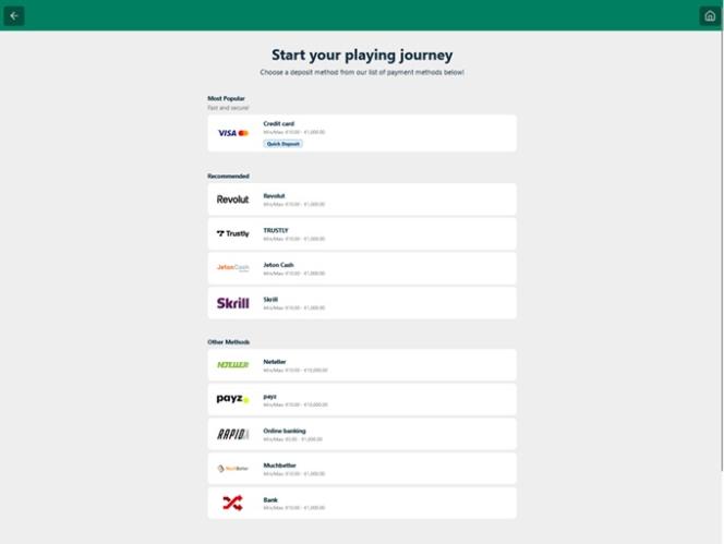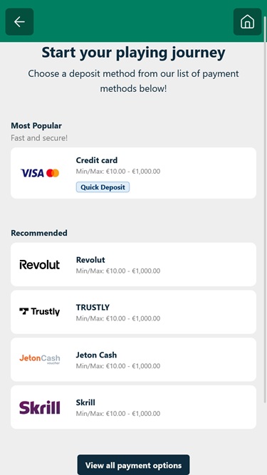 فيما يتعلق بخيارات الدفع، تتوفر مجموعة واسعة من الخيارات لإدارة أموالك، بما في ذلك سكريل ، ونتلر ، وآبل باي ، والتحويل البنكي، وMuchBetter، وباي زد ، وترستلي، وجوجل باي . كما يقبل الكازينو العديد من العملات المشفرة، بما في ذلك بيتكوين ، وبيتكوين كاش، وإيثريوم ، ولايتكوين ، وتيثر، وريبل .
