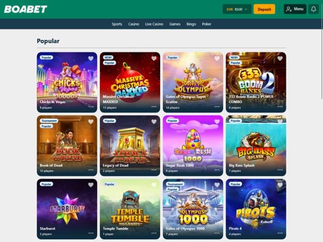 لمحبي ألعاب ماكينات القمار على الإنترنت، أعدّ BoaBet مجموعة مذهلة من ألعاب القمار، تتضمن فئات وأنواعًا وآليات وميزات وموضوعات فريدة. هناك آلاف من ألعاب القمار المتاحة لتجربتها، بما في ذلك خيارات اللاعبين المشهورين مثل: